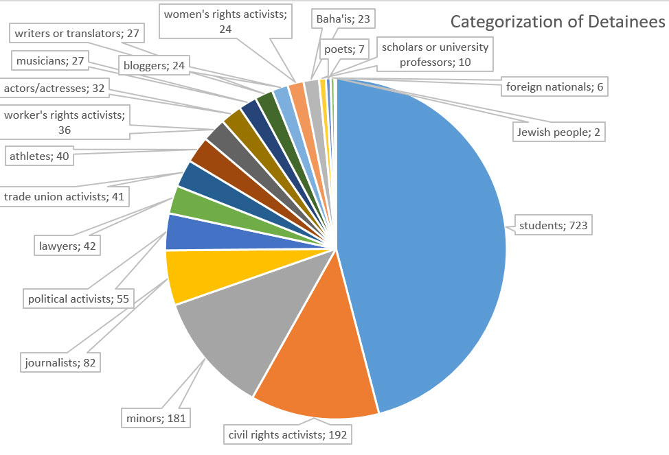 These detainees include 723 students, 192 civil rights activists, 181 minors, 82 journalists, 55 political activists, 42 lawyers, 41 trade union activists, 40 athletes, 36 worker’s rights activists, 32 cinema, theatre actors/actresses, 27 singers or musicians, 27 writers or translators, 24 bloggers or social media influencers, 24 women’s rights activists, 23 Baha’is, 10 scholars or university professors, 7 poets, 6 foreign nationals, 2 of the Jewish community.