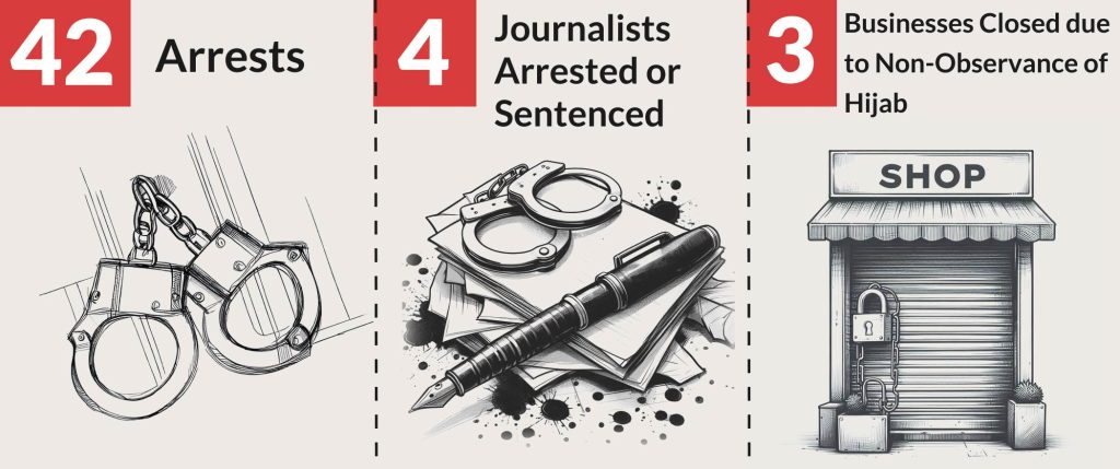 According to the report, 644 women were arrested for improper veiling. Of these, 618 cases were related to the so-called “Noor” operation, which was started in the spring of 2024 by the Iranian police. Additionally, at least 10 activists were sentenced to a total of 57 months of imprisonment and fined One hundred and forty million Iranian Rials. This includes 43 months of actual imprisonment and 14 months of suspended imprisonment, with 7 months of these sentences issued by appellate courts. Furthermore, 2 individuals were sentenced to 148 lashes.