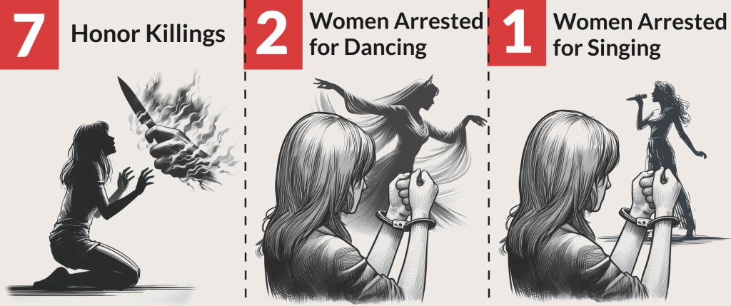 In 2024, a total of 238 reports were collected in the category of women’s rights, as per the Department of Statistics of Human Rights Activists in Iran. These reports included at least 26 cases of rape and sexual assault, 114 instances of women’s murders, 37 cases of honor killings including 23 men, 1 case of self-immolation, 3 suicides, at least 16,264 cases of domestic violence, 10 cases of assault, 4 acid attacks, 14 summonses to judicial and security institutions, 30,629 instances of improper hijab, 3 travel bans, 2 court trials and 5 instances of discrimination in social settings. It is worth mentioning that at least 365 business units were sealed by the Public Places Supervision Office due to non-compliance with the mandatory hijab.