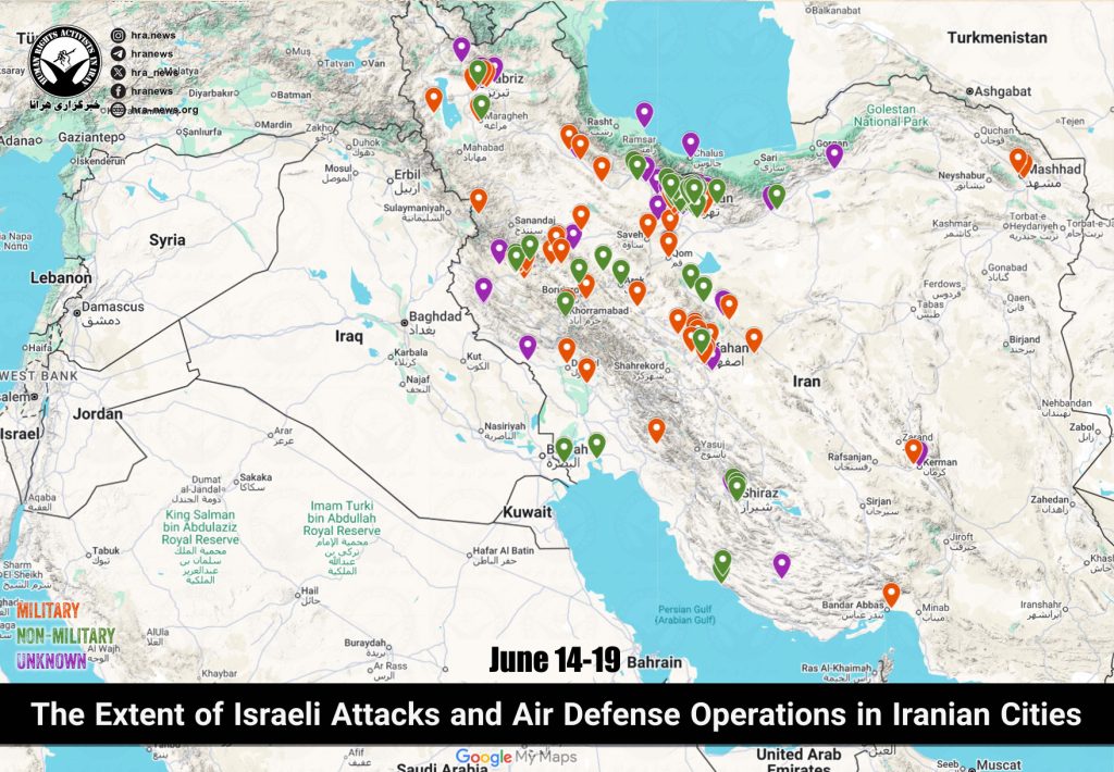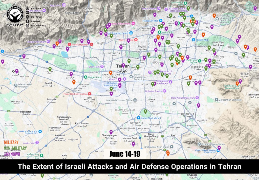 On Monday, June 16 (26 Khordad), the fourth consecutive day of conflict, Israeli attacks again targeted several civilian infrastructures. On this day, air defense engagements were reported in Bushehr, Qeshm, Bandar Abbas, Dehloran, Natanz, Tehran, Sanandaj, Tabriz, Kermanshah, Ahvaz, Bandar Anzali, Bostan Abad, Marand, and Malayer. Tehran experienced the highest number of attacks among all affected provinces. In and around Tehran, targeted areas included Khalazir village, Shahrak-e Gharb, Bidganeh, Vavan, Bagheri, Olympic Village, Mehrabad Airport vicinity, Azadi Square, Tehranpars, and the IRIB (state broadcaster) building.