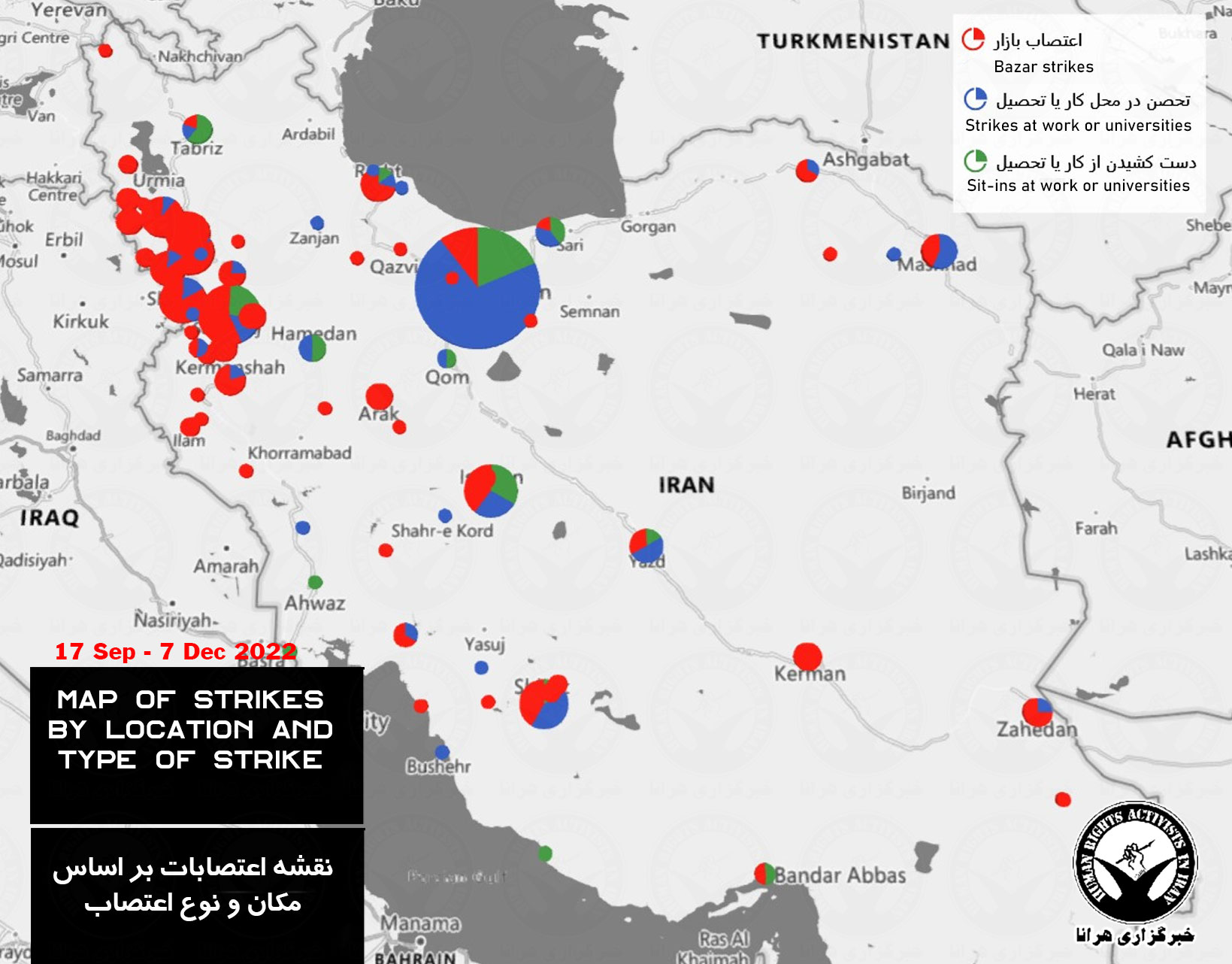In total, businesses in 53 cities went on strike a total of 163 times in 82 days by closing their shops. During this period, educational centers or workshops went on strike in 33 cities with 110 protests at their premises. In addition, 14 cities were scenes of protests either at the place of study or businesses where these protests took place at least 43 times.