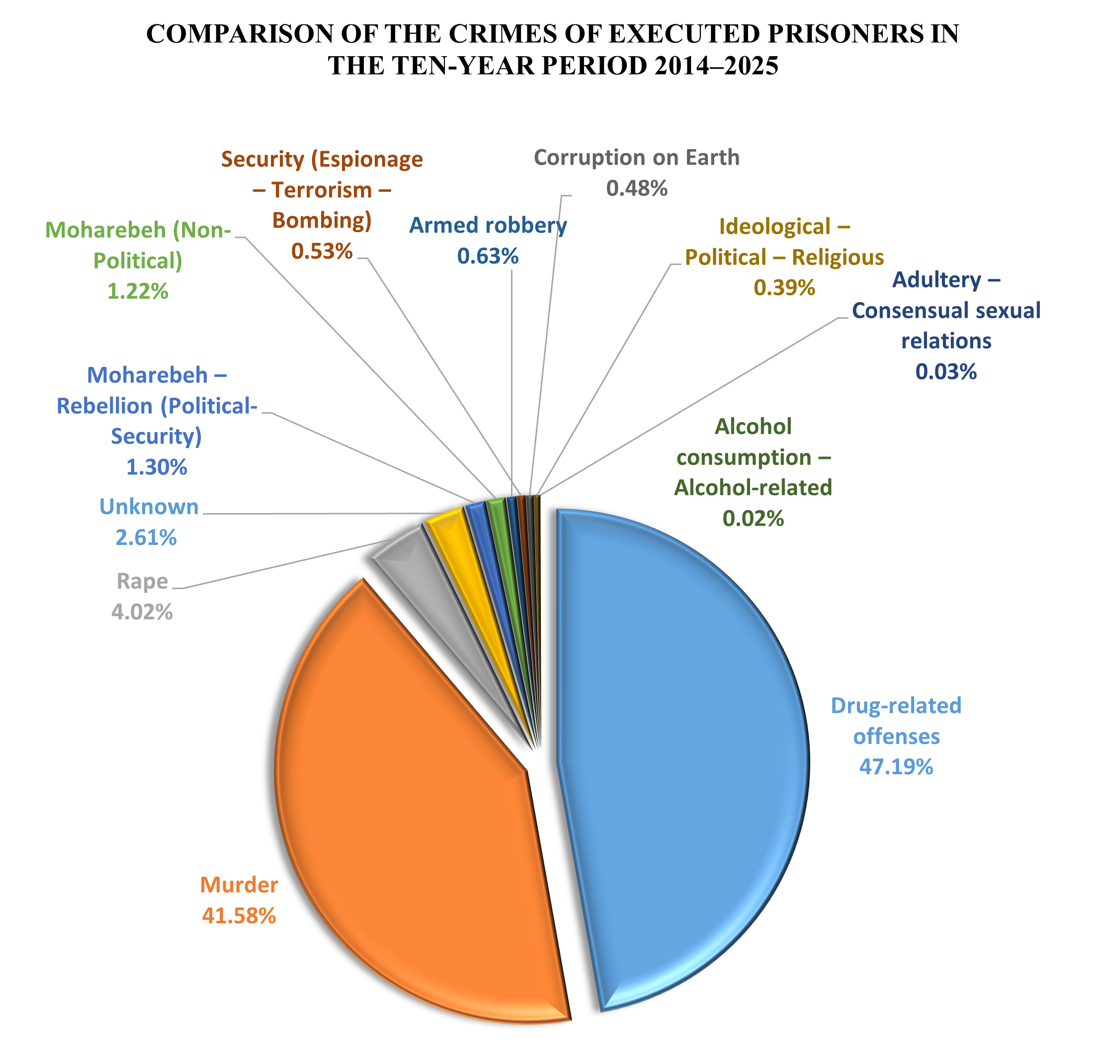 During this period, a significant portion of executions were related to drug offenses, followed by intentional murder as the second most common charge. Other charges, including rape, armed robbery, moharebeh, corruption on earth, security and political offenses, as well as crimes related to sexual conduct or alcohol—have comprised a smaller share of the total executions.