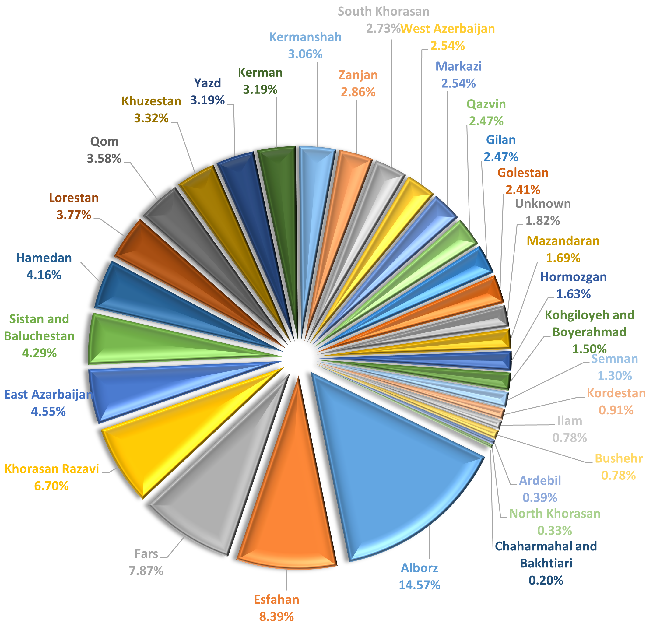 The pie chart below displays execution numbers by the province in which they took place. According to this chart, the Alborz (where three overcrowded prisons are located) had the highest number of executions at 14.57%. Isfahan and Fars Provinces come second and third, with 8.39% and 7.87%, respectively.