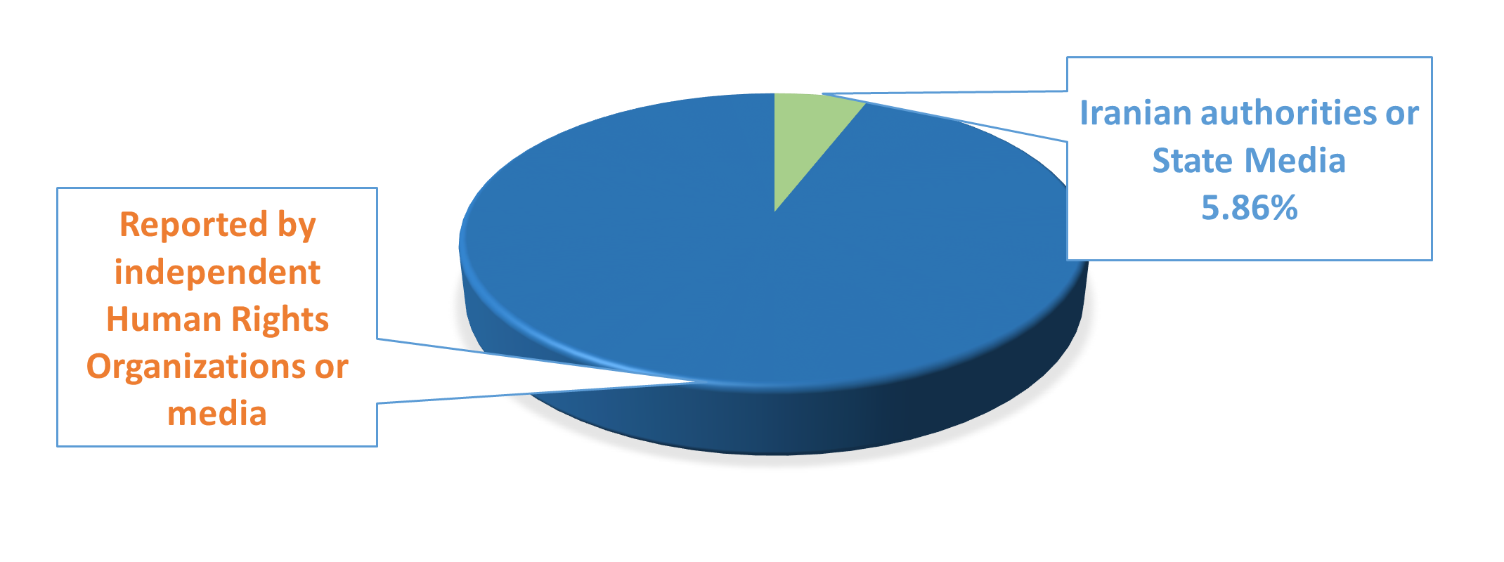The chart below depicts the distribution of executions’ information sources. The chart indicates that 94.14% of HRANA-confirmed executions were not announced by the official Iranian sources. Undisclosed executions are referred to as “secret” executions.