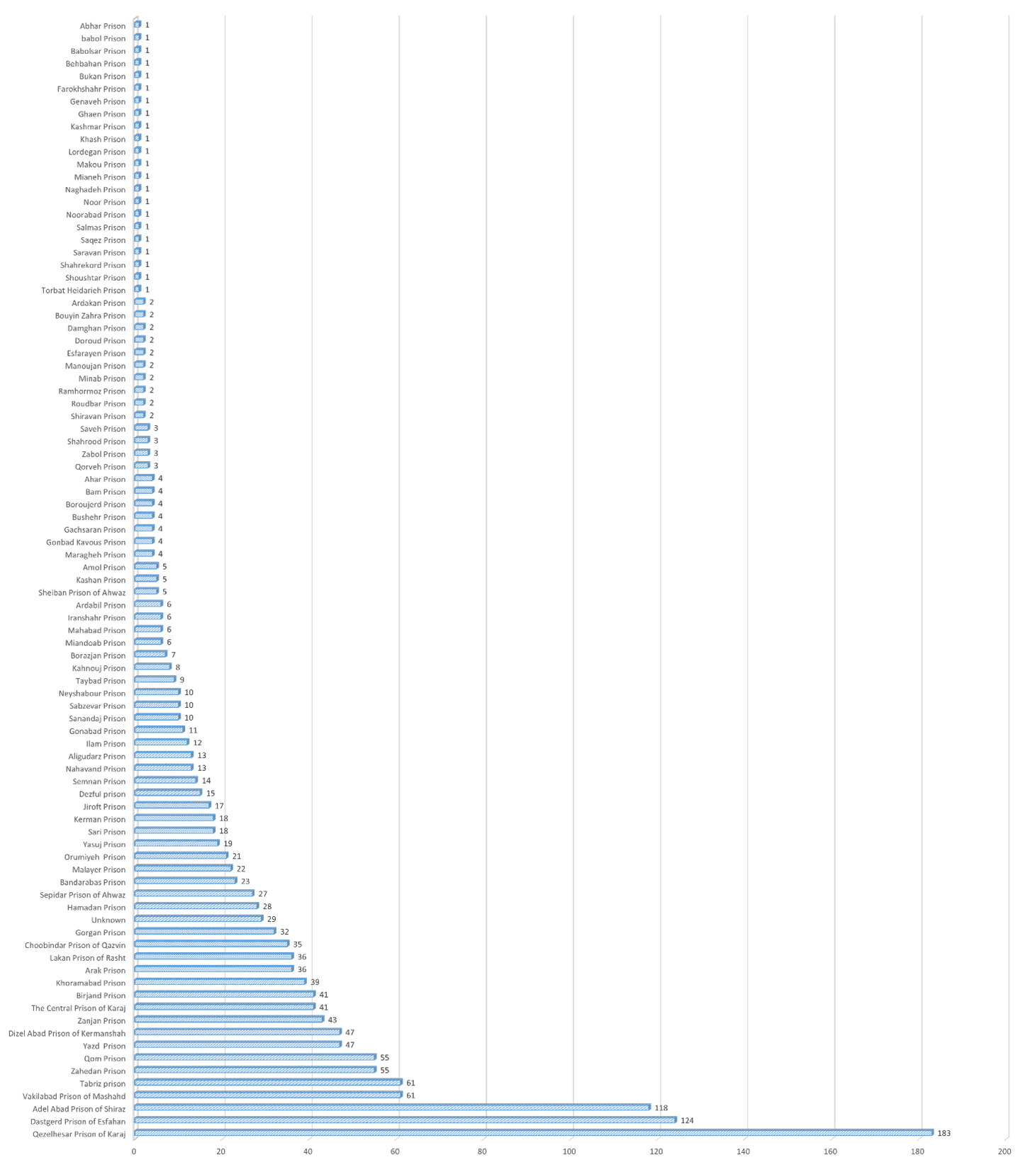 The chart below displays execution numbers by the prison where the executions were carried out. The Qezel Hesar Prison of Karaj And Dastgerd Prison of Esfahan officials have carried out the highest number.