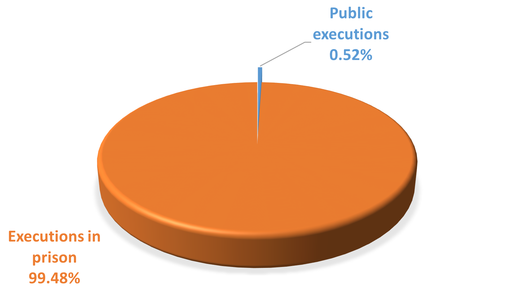 The chart below displays percentage of executions carried out in public vs the number of executions that were carried out in prison. According to statistics, 0.52% of the executions in Iran were carried out in public.