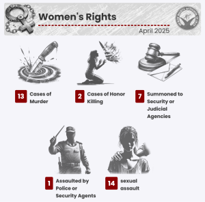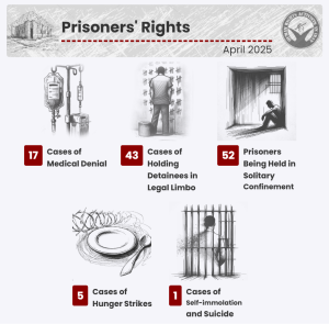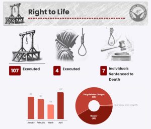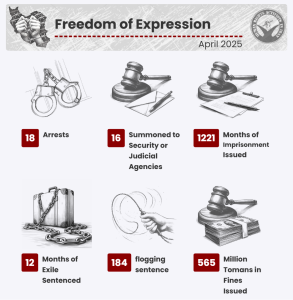 HRANA News Agency -In April 2025, HRANA, via its Statistics Department, documented a continued deterioration in Iran’s human rights conditions. April marked the highest number of executions since the beginning of the year, with 107 individuals executed. It also saw the highest number of prison sentences issued this year against citizens for expressing their beliefs and opinions. Numerous other instances of human rights violations were also reported, as detailed below. The findings presented here aim to inform the public and international community of the systemic challenges within Iran’s legal, political, and social institutions.