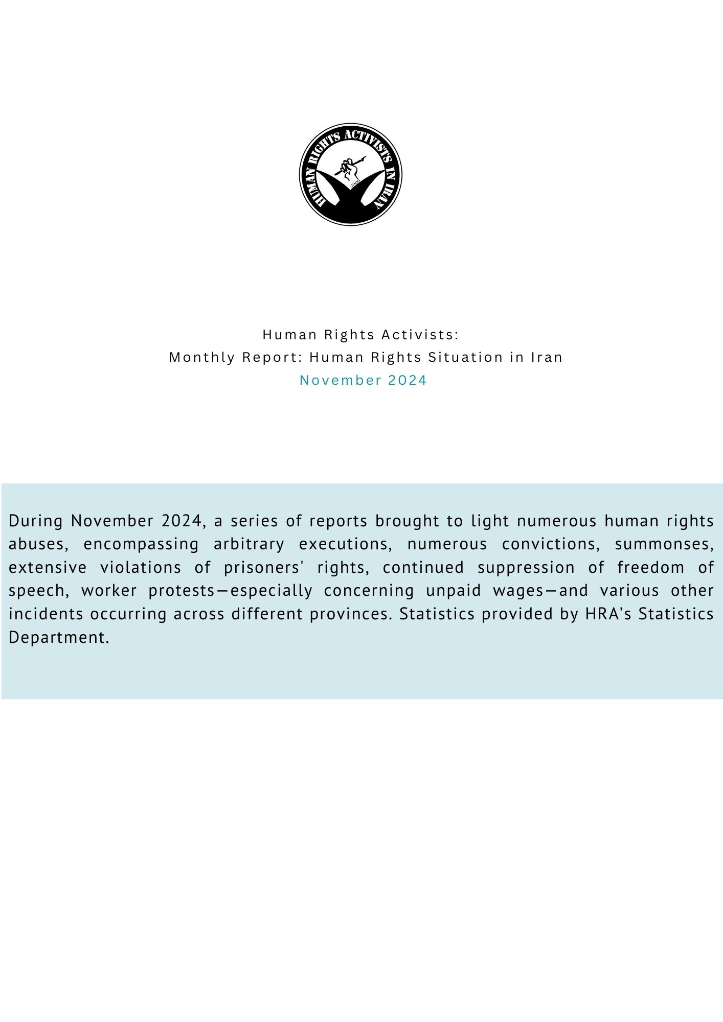 In November, there were 30 cases of prisoners lacking medical care and 34 cases of incommunicado detention, leaving families in the dark about the prisoners’ fates due to a lack of contact. Furthermore, 47 prisoners have been transferred to solitary confinement, 9 prisoners have had no access to a lawyer, and 5 have gone on hunger strikes in protest of their conditions.
