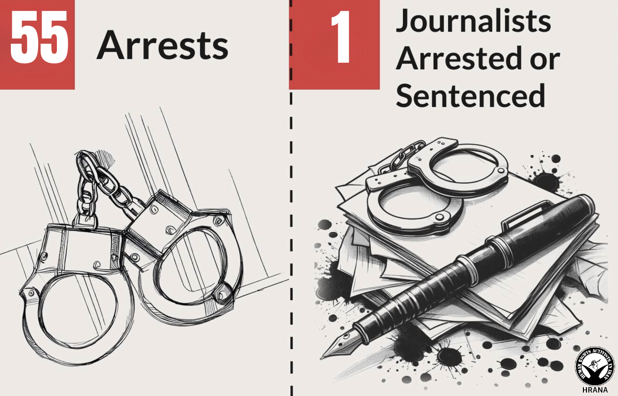 Iran continues to crack down on anyone who protests or criticizes the regime, persistently violating the right to freedom of expression and thought. This month alone, 55 individuals have been arrested related to freedom of expression, 29 trials, and 4 people were arrested without any judicial order. There were also 6 cases of assault and battery by a police officer and 1 journalist was required to pay a fine of 6,600,000 Tomans, Mojtaba Rahimi a journalist at Arman Imroz newspaper was accused of publishing falsehoods with the aim of disturbing the public mind.
