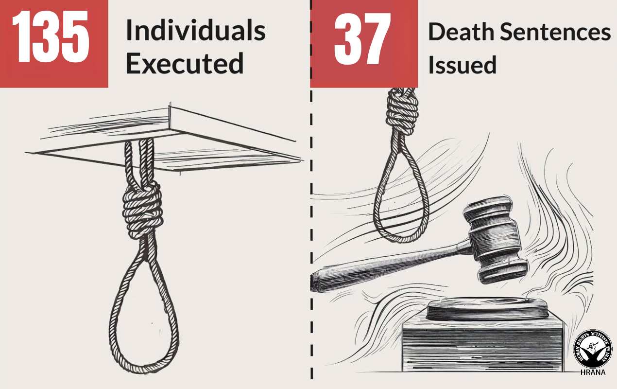 HRANA – HRA’s Statistics Department has released its monthly report for November 2024, highlighting ongoing human rights violations across Iran. This month, 135 individuals were executed, comprising 127 men, 4 women, and 1 juvenile offender, including 11 Afghan citizen. Alongside these executions, 37 individuals were sentenced to death, underscoring a persistent use of capital punishment in Iran, often for offenses that do not meet international standards, notably drug-related crimes. 68 people were executed for drug-related offenses this month, a practice starkly contradicting the right to life as articulated in the International Covenant on Civil and Political Rights (ICCPR).