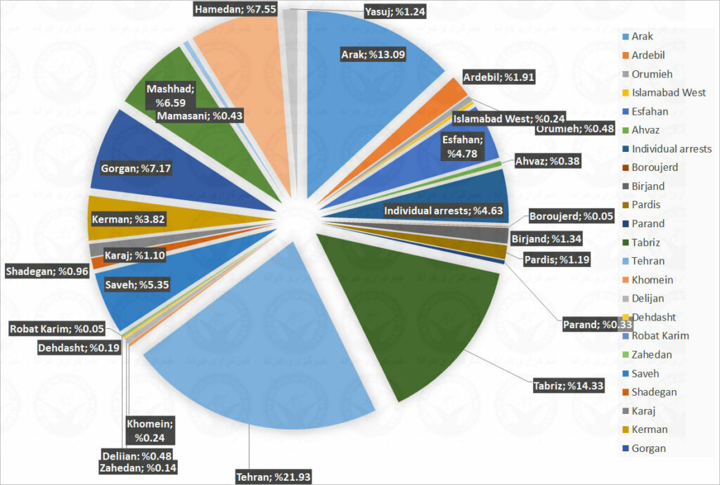 Out of the total of 71 cities where the protests occurred, no specific reports on the arrestees have been published by the Iranian authorities or human rights organizations. However, according to 22 statements made by the Iranian judicial authorities and 3 reports by human rights organizations, a total of 2,094 arrests have been made to this day.