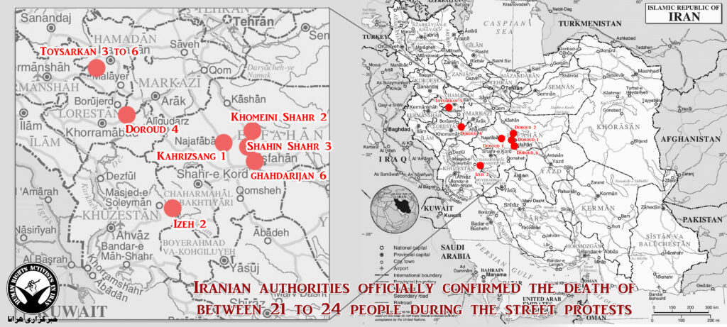 According to official statistics by the Iranian authorities, at least between 21 to 24 people were killed during the protests in the following areas: Dorud, Khomeyni Shahr, Izeh, Shahin Shahr, Tuyserkan, Kahrizsang, Ghahdarijan. The difference in number of reported deaths in Tuyserkan is due to the existing contradictory reports by the government sources. See the following: