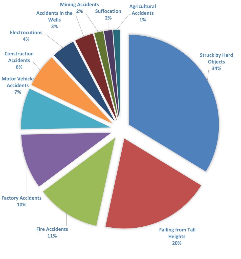Based on data gathered by HRA’s Statistics and Publication Center, (a collection of 3,730 reports published in the 12 month reporting period) 34% of workplace accidents were caused by being struck by hard objects, 20% by falling from tall heights, 7% by motor vehicle accidents, 6% construction accidents, 10% factory accidents, 10% fire accidents, 3% accidents in the wells, 4% electrocutions, 2% accidents in the mine, 2% suffocation and 1% agricultural accidents.