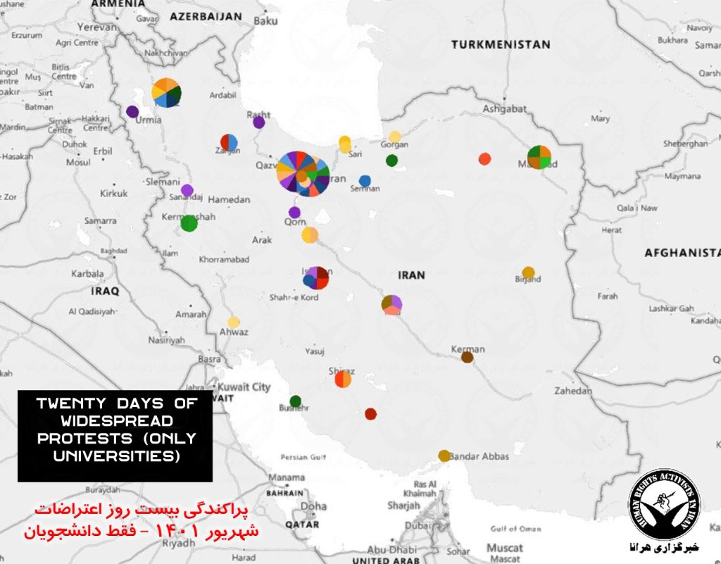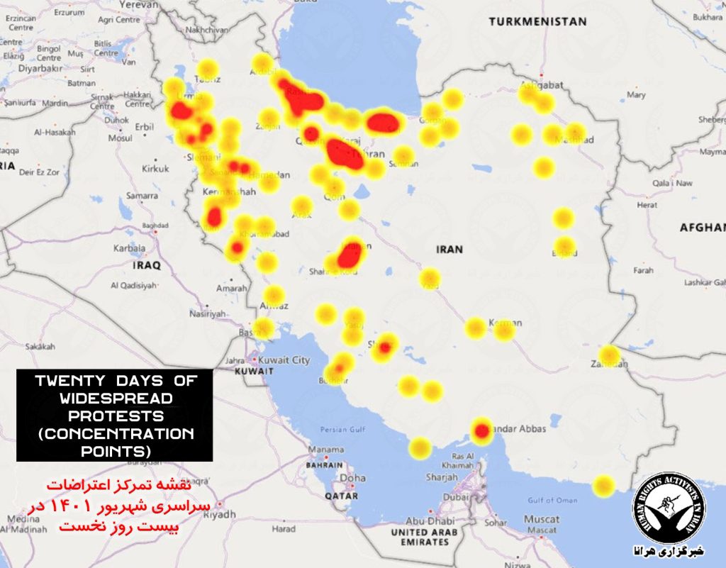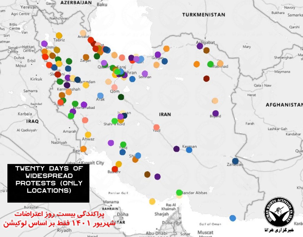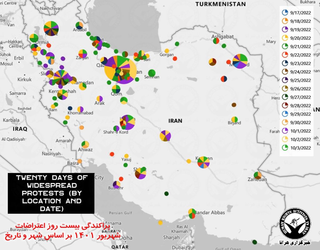 HRANA, the news agency of Human Rights Activists – Mahsa Amini, a 22-year-old young woman, was arrested by the morality police for the crime of improper hijab. Her arrest and death in detention fueled nationwide protests in Iran. Protesters came to the streets with the central slogan “Women, Life, Freedom” in protest against the performance, laws and structure of the regime. The following 209-page report is dedicated to the statistical review, analysis, and summary of the first twenty days of the ongoing protests (September 17 to October 5, 2022). In this report, in addition to the geographic analysis and the presentation of maps and charts, the identity of 200 deceased, including 18 children and teenagers, an estimated of 5,500 arrested along with the identity of 563 arrested citizens, 123 students and 36 journalists or activists in the field of information is compiled. In addition the report includes a complete collection of 698 verified video reports by date and topic. The report examines protests across 342 documented gatherings in all 31 provinces of the country, including 105 cities and 68 universities.