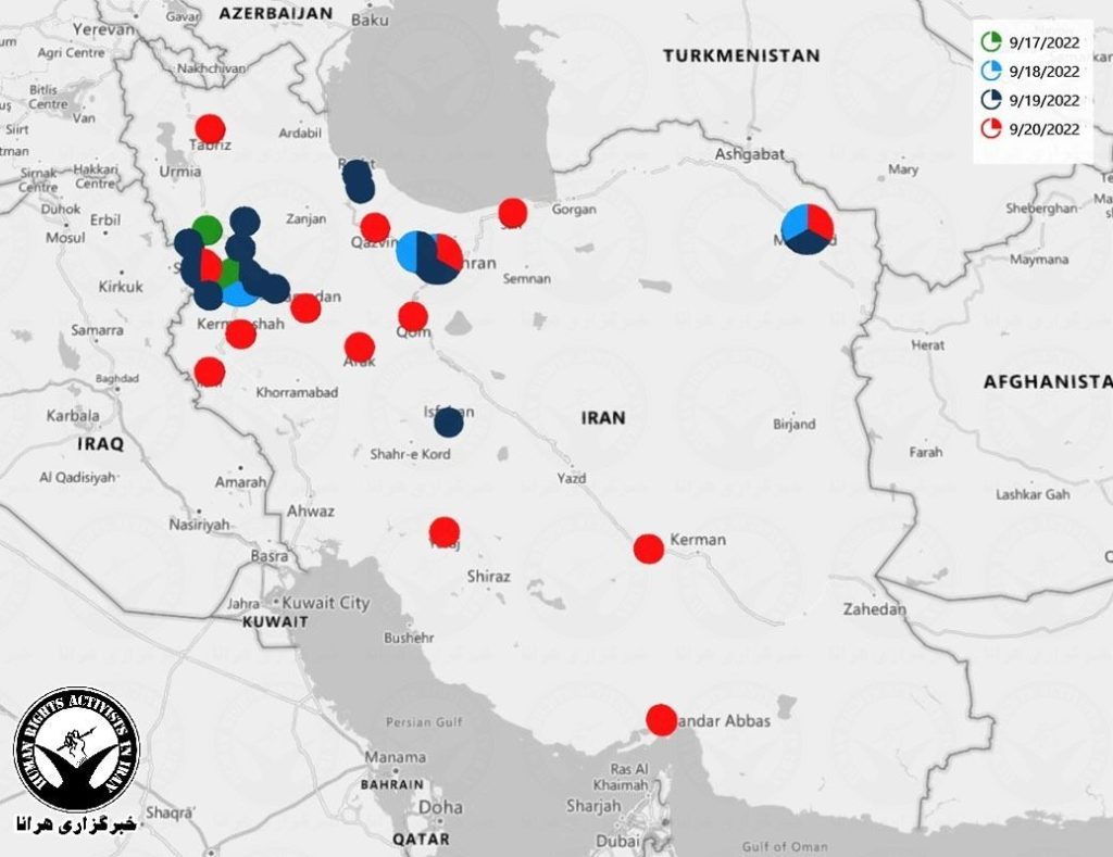 On September 20, 2022, nationwide protests over the death of Mahsa Amini by Morality Police were held in at least 26 cities in Iran. In most cities, the protest turned violent as the police used teargas, pellet guns and shotguns against the protestors. According to the reports obtained by HRANA, the internet and phone services were shut down or disrupted in numerous cities across the country, including in Arak, Qazvin, Kermanshah, Bukan, Baneh, Sanandaj, Tehran, Saqqez, and Ahvaz.