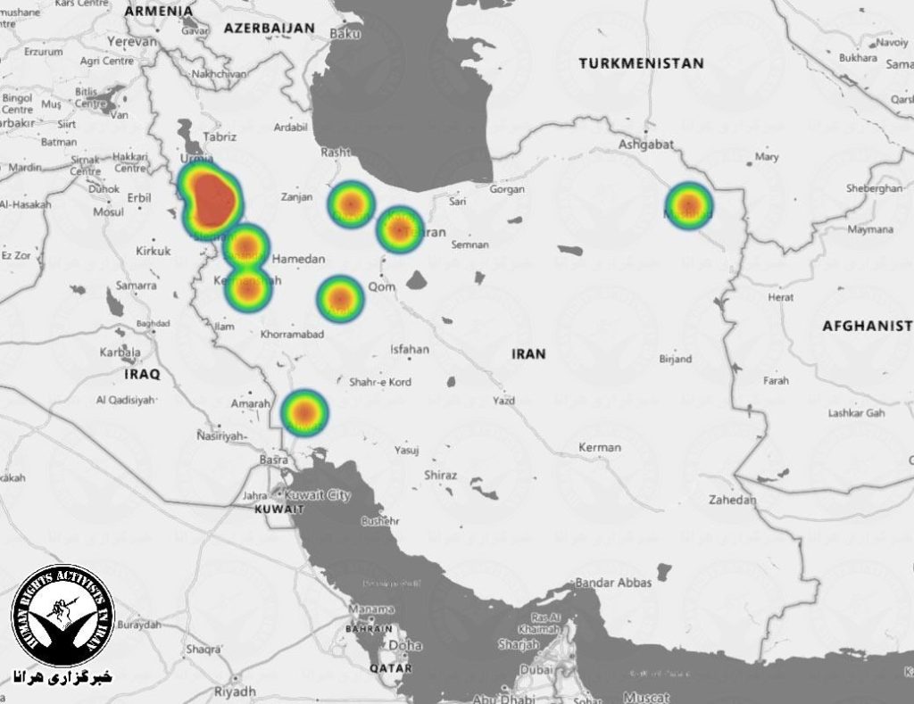 The map below shows the geographical distribution of protests in the past four days in at least 26 cities. These cities include Mashhad, Tabriz, Qazvin, Sabzevar, Mariwan, Bandar-Abbas, Bukan, Rasht, Rafsanjan, Sari, Arak, Hamedan, Tehran, Qom, Yasuj, Ilam, Kermanshah, Birjand, Karaj, Isfahan, Kerman, Shiraz, Khorramabad, Kish, Zanjan, and Naqade.