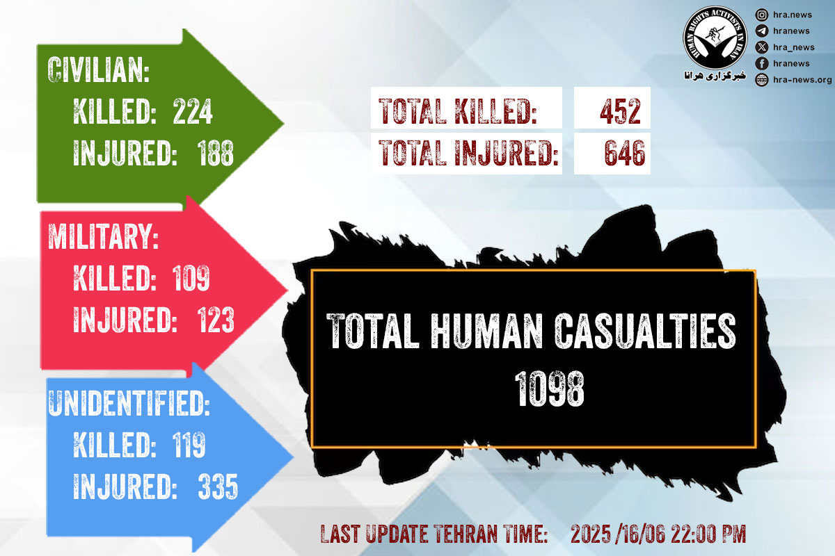 In addition to the figures reported during the first four days of attacks, HRANA, after reviewing and verifying additional information and documentation, has added 806 more fatalities and injuries to its earlier casualty reports for those initial days. However, in some cases, these new figures reflect reclassification of victims rather than an actual increase in total numbers.
