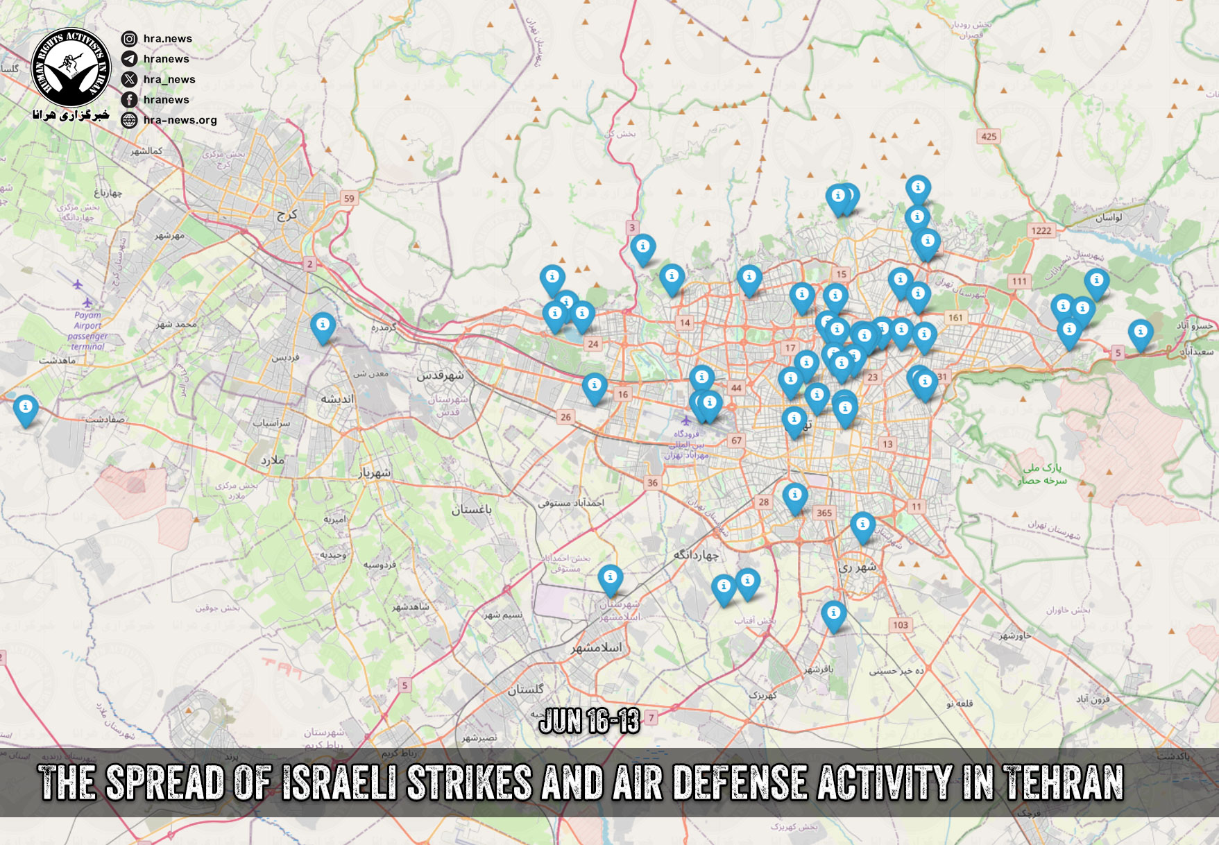 According to documented reports, the following civilian areas were targeted: Piroozi Street, areas near IRIB headquarters, Majidieh, Andarzgoo, Sabalan Square, Velenjak, Pasdaran, and Elahieh in Tehran; Valayat District in Qazvin; and areas near Alavijeh Junction in Shahin Shahr.