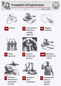 In May, the Iranian judiciary sentenced twenty Iranian citizens to a total of 866 months in prison on charges indicative of violations of free expression. Of this total, 36 months were suspended sentences. In addition to the prison terms, the courts also issued sentences of ten lashes and twelve months of exile. One example is the sentencing of Taher Haji Ghorbani to 14 years and 2 months in prison on charges including insulting sacred beliefs, propaganda against the regime, and spreading false information.