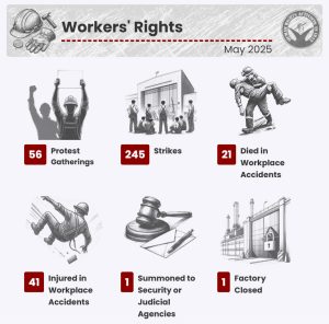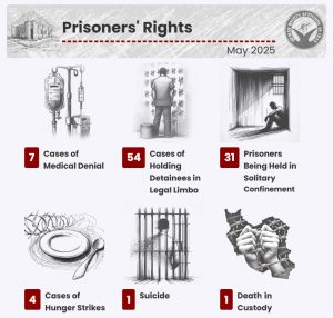 In May, guilds and unions held 160 protest gatherings—more than three times the number recorded in the previous month. One strike was also reported during this period. Also, security forces arrested seven individuals, including four teachers who were detained during a Labor Day protest in Tehran.