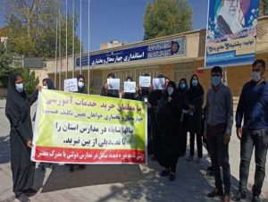 A group of contracted teachers and educators from the counties of Chaharmahal and Bakhtiari Province assembled in front of the government building in Shahrekord to protest this year layoffs.